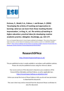 Petrova, P, Mudd, S.A, Palmer, I and Brown, S (2024) 'Developing the artistry of teaching and approaches to learning: what we can learn from those teaching theatre improvisation.' In: King, H, ed. The artistry of teaching in higher education: practical ideas for developing creative academic practice. Routledge, Abingdon, pp. 163-177. ISBN 9781032569529