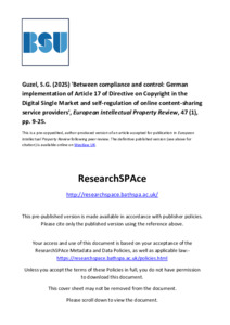 'Between compliance and control: German implementation of Article 17 of Directive on Copyright in the Digital Single Market and self-regulation of online content-sharing service providers.'
