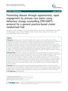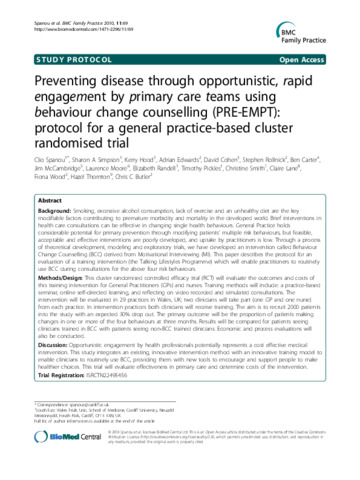 Spanou, C, Simpson, S.A, Hood, K, Edwards, A, Cohen, D, Rollnick, S, Carter, B, McCambridge, J, Moore, L, Randell, E, Pickles, T, Smith, C, Lane, C, Woods, F, Thornton, H and Butler, C.C (2010) 'Preventing disease through opportunistic, rapid engagement by primary care teams using behaviour change counselling (PRE-EMPT): protocol for a general practice-based cluster randomised trial.' BMC Family Practice, 11 (69).