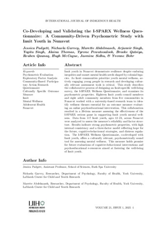 Padgett, J.K, Garvey, N, Abdelmaseh, M, Singh, A, Singh, Y, Thomas, A, Pewatooalook, T, Qatsiya, B, Qaunaq, R, McCague, H, Sidhu, J and Bohr, Y (2025) 'Co-developing and validating the I-SPARX Wellness Questionnaire: a community-driven psychometric study with Inuit youth in Nunavut.' International Journal of Indigenous Health, 21 (1).