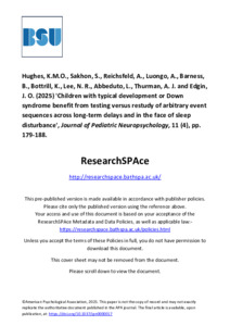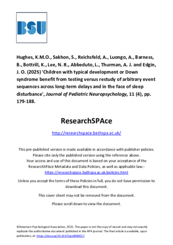 Hughes, K.M.O, Sakhon, S, Reichsfeld, A, Luongo, A, Barness, B, Bottrill, K, Lee, N. R, Abbeduto, L, Thurman, A. J and Edgin, J. O (2025) 'Children with typical development or Down syndrome benefit from testing versus restudy of arbitrary event sequences across long-term delays and in the face of sleep disturbance.' Journal of Pediatric Neuropsychology, 11 (4). pp. 179-188.