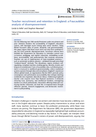 la Velle, L and Newman, S (2025) 'Teacher recruitment and retention in England: a Foucauldian analysis of disempowerment.' Journal of Education for Teaching. doi: 10.1080/02607476.2025.2590049