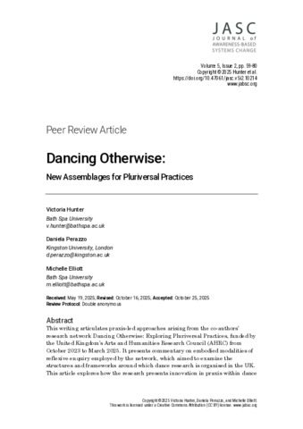 This writing articulates praxis-led approaches arising from the co-authors’ research network Dancing Otherwise: Exploring Pluriversal Practices, funded by the United Kingdom’s Arts and Humanities Research Council (AHRC) from October 2023 to March 2025. It presents commentary on embodied modalities of reflexive enquiry employed by the network, which aimed to examine the structures and frameworks around which dance research is organised in the UK. This article explores how the research presents innovation in praxis within dance studies and dance research, and contributes to an emerging inter- and transdisciplinary field of awareness-based approaches to systemic transformation.