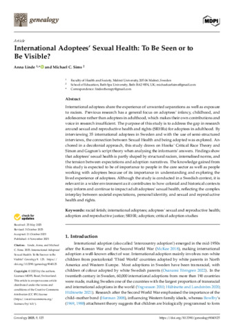 Linde, A and Sims, M (2025) 'International adoptees’ sexual health: to be seen or to be visible?' Genealogy, 9 (4). e125.