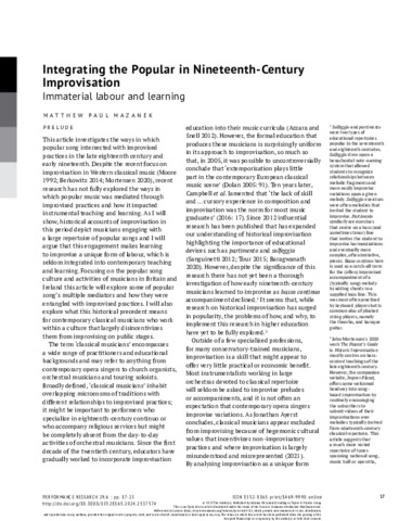 This article explores the intersection of popular song and improvised practices in the nineteenth century and offers a critical reflection upon the theoretical and pedagogical implications for contemporary musicians. It first contextualizes recent research and then provides new insights into the highly distributed nature of improvised practices in the nineteenth century. Using a wide range of primary sources, this paper explores the activities of a network of both prolific and lesser-known figures ranging from pianist Ignaz Moscheles to guitarist Trinitario Huerta and Irish author Sydney Morgan. The activities of such varied figures demonstrate how practices of improvisation were embedded within overlapping discourses on popular repertoires, pedagogical schools of thought, and performance aesthetics. Following Kurt Danziger’s concept of a ‘generative schema’ (1990), the paper frames the engagement with these overlapping networks as a set of shared conceptual beliefs and organised responses I have called the ‘improvisation/variation schema’. Using Michael Hardt and Antonio Negri’s concept of immaterial labour (Empire, Harvard University Press, 2001), I argue that this improvisation/variation schema was a productive framework that entailed a unique type of symbolic and affectual labour precisely because of improvisation’s entanglement with the popular music of the nineteenth century. This entanglement was a product of various factors including not only popular music’s increasingly commercialized forms of transmission but also the improvised concert fantasia and pedagogical materials for instruments like the piano, guitar and harp. I conclude that learning to improvise in a nineteenth-century style today requires engaging in this type of labour and recognizing popular song’s ability to comment upon and reflect contemporary socio-political thought.