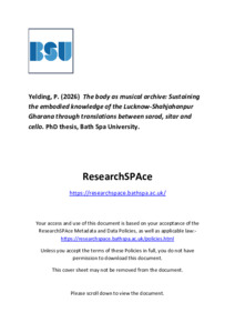Yelding, P (2026) The body as musical archive: sustaining the embodied knowledge of the Lucknow-Shahjahanpur Gharana through translations between sarod, sitar and cello. PhD thesis, Bath Spa University. doi: 10.17870/bathspa.00017570