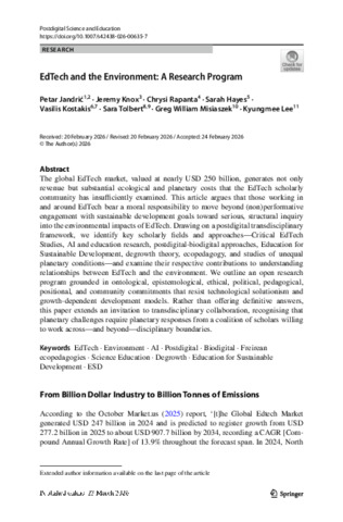 | Keywords: | EdTech, environment, AI, postdigital, biodigital, Freirean ecopedagogies, science education, degrowth, Education for Sustainable Development, ESD |