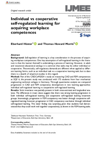 Background:- Self-regulation of learning is a key consideration in the process of acquiring workplace competences. One key assumption of self-regulated learning in the literature is that the learner themself is undertaking a process of learning. However, in adult and vocational educational settings it is common that tasks may be either individual or cooperative. Theoretically, self-regulatory demands are different when applied to different learning forms, such as an individual task vs a cooperative learning task; but to date there is a dearth of empirical studies in this regard. Method:- Part of the CADCoM2024 + study on measuring CAD and FEM competences at EQF 6, the present study was conducted with 175 students from four mechanical engineering technical colleges in Germany. Through quantitative analysis we compared progression in CAD and FEM competency development in two learning approaches: individual self-regulated learning vs cooperative self-regulated learning. Results:- Strict invariance was partially present in both cross-sectional and longitudinal analyses. The differences in mean values suggest that there was strong learning progression in both individual self-regulated learning and cooperative self-regulated learning treatment groups. Interestingly, progression in FEM competency was better through cooperative self-regulated learning; however, progression in CAD competency was better through individual self-regulated learning. This latter finding was surprising given that students had demonstrated that they could work well together cooperatively, as shown in the FEM learning tasks. Conclusion:- This original interdisciplinary study suggests that skills for both individual and cooperative self-regulated learning are important for optimally acquiring workplace competences. Indeed, an important finding from this original study was that both individual and cooperative self-regulated learning are recommended as learning strategies: students made strong progress in competency development in both learning forms. Whether individual self-regulated learning or cooperative self-regulated learning is chosen as a pedagogical strategy for fostering workplace competences may depend on a variety of factors (such as interest, previous experience, social environment, and nature of the task). Further studies, including studies with larger sample sizes, are required to unpick this complexity and to confirm which factors might influence the pedagogical choice between individual and cooperative self-regulated learning strategies for competency development.